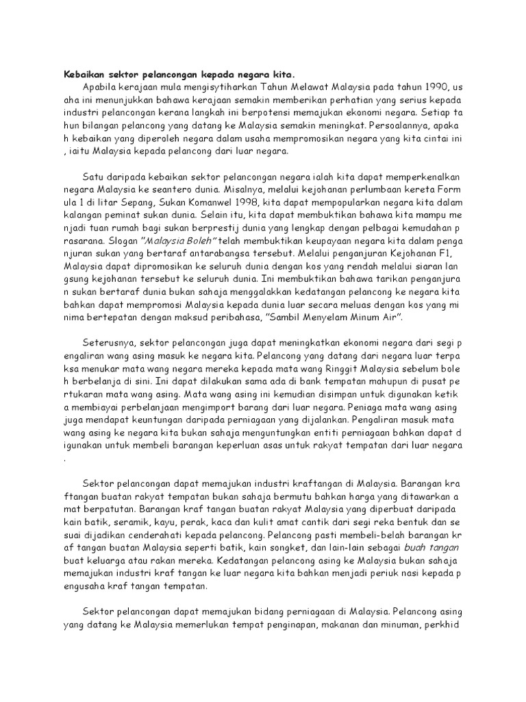 Karangan usaha usaha meningkatkan pelancongan mp3 & mp4. Industri pelancongan adalah merupakan antara sektor terpenting bagi perkembangan dan kemajuan bagi sesebuah negara. Sekali lagi malaysia akan menjadi tumpuan pelancong pada 1994 kerana kerajaan telah melancarkan tmm 94. Industri pelancongan di malaysia telah dikenalpasti sebagai pendorong utama di dalam sektor perkhidmatan. Contoh karangan pelancongan terbaik pt3 contoh karangan pelancongan pt3 : Langkah memajukan industri pelancongan negara lsektor pelancongan di negara kita berkembang maju dan menjadi sumber pendapatan negara yang penting. Sektor pelancongan telah mengambil peranan yang lebih besar dalam merangsangkan ekonomi dalam tempoh rancangan malaysia kelapan. Sebagai sebuah negara yang beriklim khatulistiwa, malaysia mempunyai alam semula jadi yang unik dengan deretan pulau yang menawan. Kempen tahun melawat malaysia perlu diadakan dengan lebih berkesan dan melibatkan lebih banyak documents similar to karangan galus ; Dalam usaha memajukan industri kraftangan di malaysia, kerajaan melalui agensinya telah berusaha untuk mempromosikan industri kraf tangan di peringkat antarabangsa. Empat langkah aktifkan industri pelancongan. Industri pelancongan sudah sememangnya besar, telah pun berkembang secara tekal dengan pantas untuk tempoh 10 tahun yang lepas dan juga mempunyai kedudukan daya saing global yang kukuh. Industri pelancongan dikatakan penyumbang utama kepada ekonomi negara ini terutama ketika dunia mengalami masalah kegawatan ekonomi yang ketara.