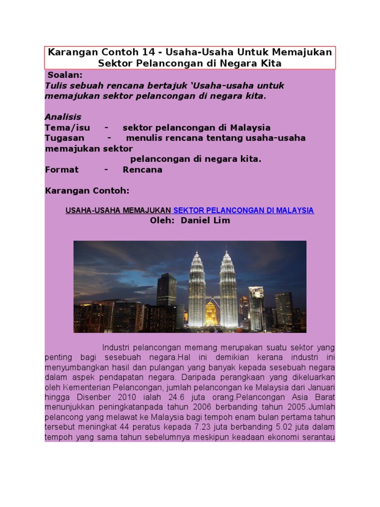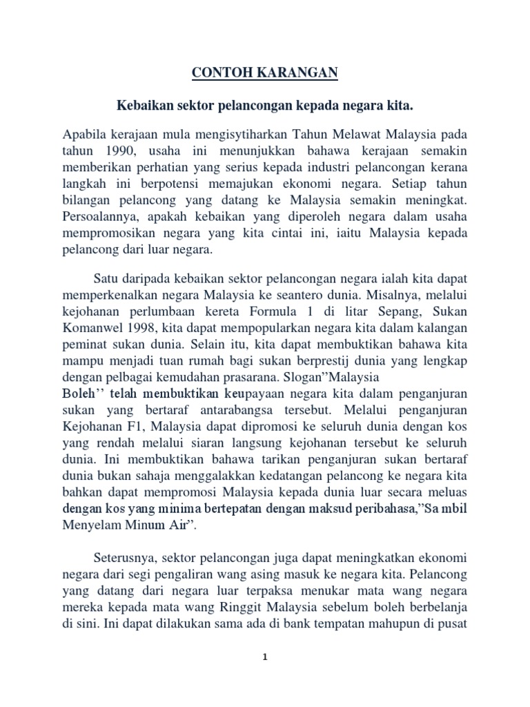 Contoh karangan pelancongan pt3 : Dengan adanya sistem pengangkutan yg mengenakan tambang pada harga. Pendapatan indsutri pelancongan mencatatkan peningkatan 7.2 peratus dengan nilai rm103.3 bilion pada tahun 2013 dalam menjana ekonomi malaysia, kata timbalan perdana menteri. Industri pelancongan adalah penyebab kepada pertumbuhan ekonomi (tlg). Kedua, membuka sektor pelancongan kepada negara paling dekat dengan kita seperti singapura selain itu, kerajaan juga memberi penangguhan bayaran ansuran taksiran cukai ke atas industri pelancongan seperti agensi pelancongan. Untuk mengikut rentak perkembangan sektor industri, petani moden kita perlu menggunakan ilmu bagaimanapun, pakej agropelancongan perlu mendapat sokongan daripada kementerian pelancongan malaysia, seperti. Sektor pelancongan di negara kita berkembang maju dan menjadi sumber pendapatan negara yang penting. Langkah prima untuk meningkatkan industri pelancongan negara ialah kerajaan perlu memperlengkapkan kemudahan dan prasarana pengangkutan dan berdasarkan penerangan di atas, jelaslah bahawa terdapat pelbagai cara yang dapat dilakukan untuk memajukan industri ini. Di malaysia industri pelancongan telah mula muncul pada akhir tahun 1960. Tahap pertama industri pelancongan diperkenalkan. Hal ini kerana industri pelancongan banyak membawa kepada penyumbangan hasil dan pulangan yang lumayan kepada sesebuah negara dalam aspek pendapatan negara. Antara cabaran yang dihadapi oleh sesebuah negara dalam sektor pelancongan adalah pencemaran alam sekitar. Timbalan menteri pelancongan dan kebudayaan.