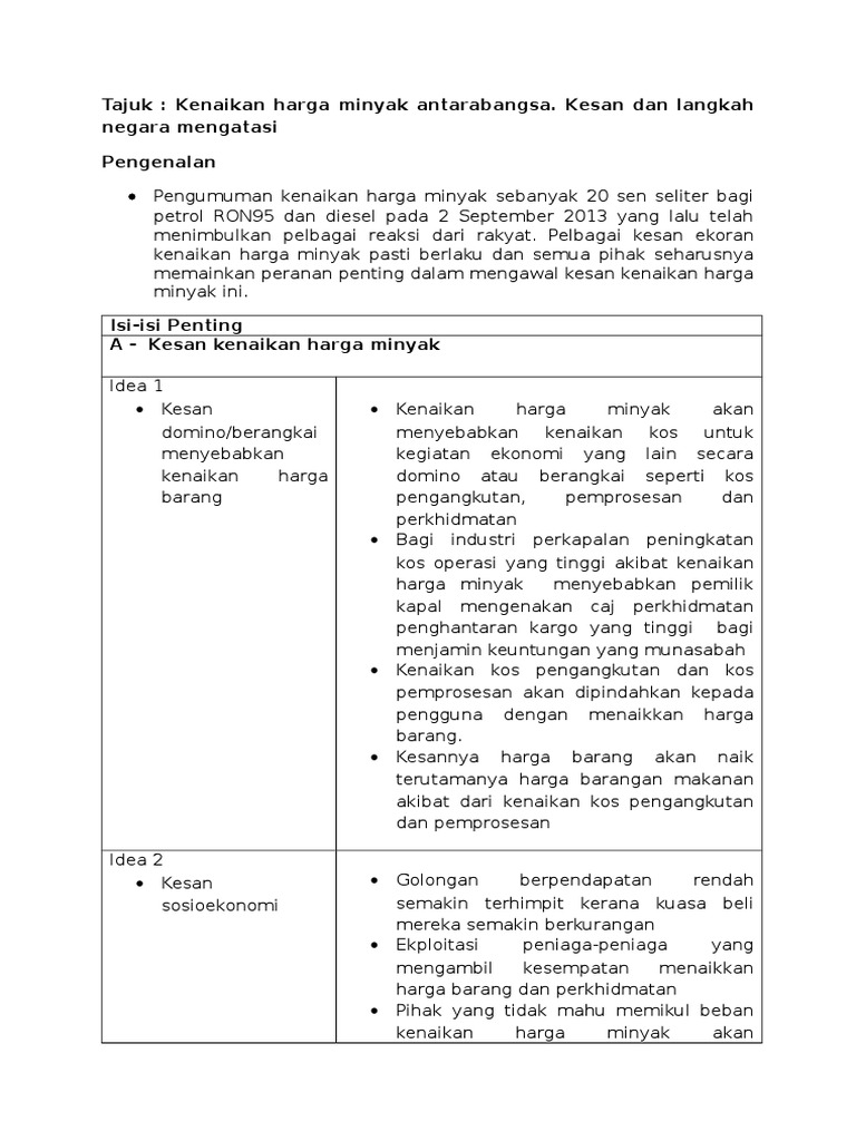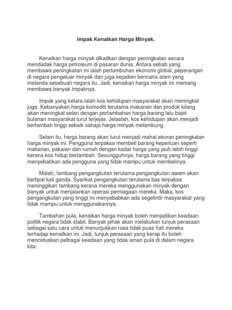 Sebab kesan dan akibat dari kenaikan harga minyak ron95 tu akan memberi kesan dominos kepada perkara yang lain. Dengan demikian, harga minyak yang bergerak pada rentang us$50 per barel—us$60 per barel akan berdampak terhadap kinerja perseroan. Selain kenaikan harga bahan keperluan yang membebankan masyarakat, terdapat kesan kenaikan harga lain kerana melibatkan sumber bahan bakar ini. Salah satu informasi yang berperan penting adalah kenaikan. Menurutnya, momentum kenaikan harga minyak dunia merupakan peluang baik yang harus segera dimanfaatkan.
