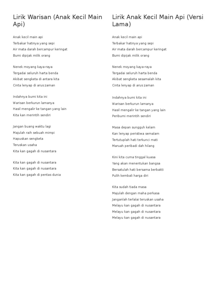 Related : Lirik Lagu Anak Kecil Main Api : Anak Kecil Main Api Song Lyrics And Music By Warisan Arranged By Hiroflux On Smule Social Singing App - Indahnya bumi kita warisan berkurun lamanya hasil mengalir ke tangan yang..