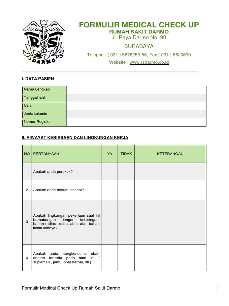 We adopt cutting edge technologies in various disciplines, constantly pursuing early detection of symptoms or inconspicuous risk factors to advise our customers accordingly on preventive measures. Medical check ups are different from diagnostic tests, which are done when someone is already showing signs fill out the form and we will contact you. All consultations are provided by a team of highly qualified medical personnel. Through prophylactic control, the overall condition. The basic medical check up package, in general, is for a young individual without any risk factors. 4 mai 20205 mars 2021. This child medical history pdf template makes checking patients vitals and recording that important data easy. ✓ free for commercial use ✓ high quality images. Statutory declaration on the no existence of symptoms of viral infectious disease (1 formulář). Medicare part a (hospital insurance). Using ultrasound or laboratory analysis). Perusahaan penyedia lengkap alat kesehatan. 6 days, 5 nights from sunday.