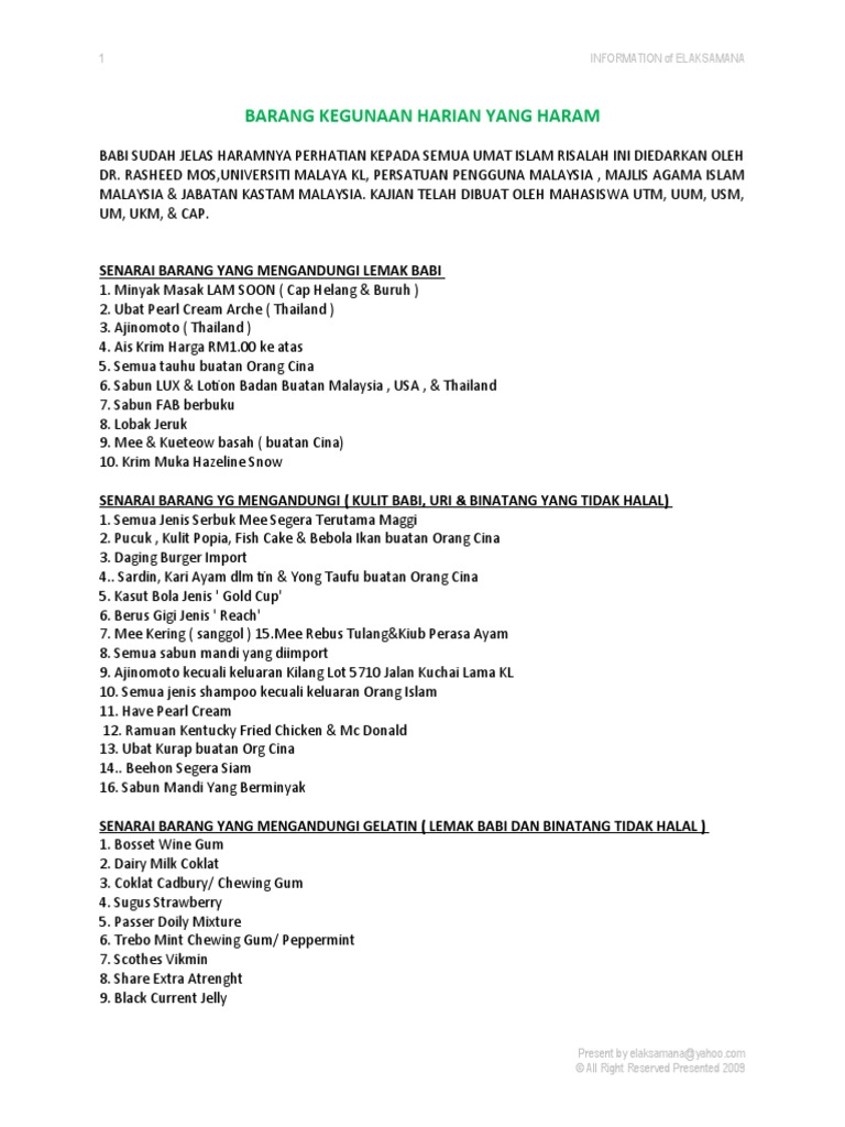 Oct 27, 2014 · senarai produk sel babi dalam kegunaan seharian media haria mei senarai nama barang yang ada babi halal senarai barang yang mengandungi lemak babi minyak masak lam soon (cap helang dan alahai~ alahai~fungsi babi kehidupan kita apr ais krim ada gelatin baja dihasilkan dari bulu babi yang diproses mentega rendah lemak gelatin di bahagian ini digunakan… Minyak masak lam soon (cap helang dan buruh) ubat pearl cream arche (thailand) ajinomoto (thailand) ais krim berharga rm1.00 ke atas This has been tested and certified by the swiss vitamin institute, a foremost authority on vitamin testing. Jun 15, 2014 · daftar barang yang mengandungi lemak babi : Ahli lembaga pengarah bellini resources (m) sdn bhd.
