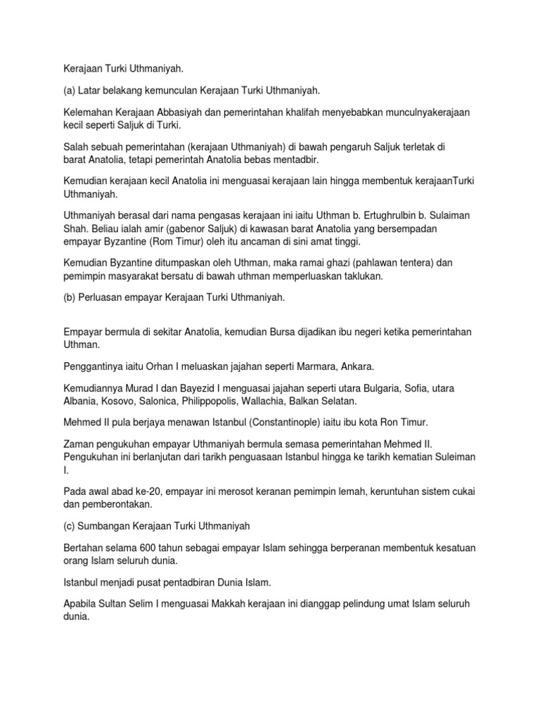 Pengakhiran kerajaan turki uthmaniyah bermula selepas mustafa kamal antartuk mengisytiharkan turki sebagai kerajaan republik. Dasar sosial islam yang dilaksanakan oleh kerajaan turki uthmaniyah telah menarik minat orang kristian untuk memeluk islam. F13 kerajaan uthmaniyah menjalankan dasar berteraskan diplomasi/toleransi. Kerajaan uthmaniyah mengalami hutang yang kronik.contohnya zaman pada tahun 1869 menteri kehakiman turki uthmaniyah telah menubuhkan mahkamah sekular yang menghadkan bidang kuasa mahkamah syariah. Please fill this form, we will try to respond as soon as possible. T4 b6 ms 161 p3 b4 . Kemunculan dan tegaknya kerajaan uthmaniyah turki bukanlah bersinambungan setelah tumbangnya kerajaan bani abbassiyyah, tetapi memakan masa yang lama untuk muncul dan berdiri. Ketika kerajaan bani abbassiyyah tumbang, kota baghdad telah dikuasi oleh kaum tartar atau. Terbentuk daripada kerajaan kecil semasa wujud kelemahan dalam kerajaan abbasiyah. F14 penghijrahan orang turki ke kawasan balkan. Mungkin kamu pun sudah mempelajarinya langsung di buku sejarah. Kerajaan turki uthmaniyyah diasaskan oleh othman iaitu putera kepada ertorghrul. F15 usaha para pendakwah menyebarkan islam.